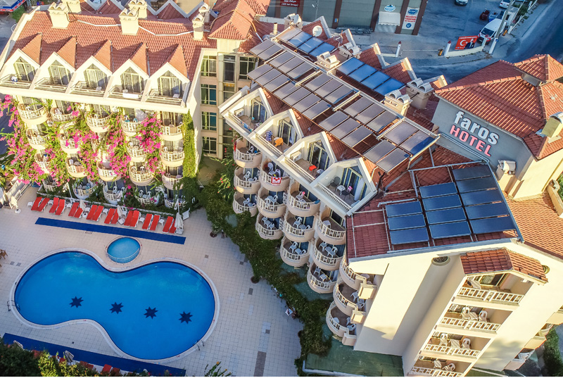 Grand Faros Hotel Marmaris’te hizmet vermektedir. 97 oda kapasitesine sahip olan otel yüzme havuzu çevresine inşa edilmiştir.